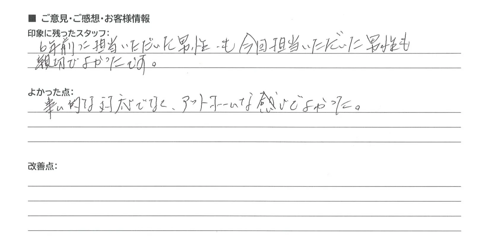 6年前に担当いただいた男性も、今回担当いただいた男性も、親切でよかってです。