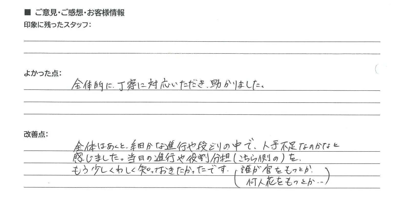 当日の役割分担について、事前の説明が不十分で申し訳ございませんでした。今後はより詳しくご案内するよう改善いたします。